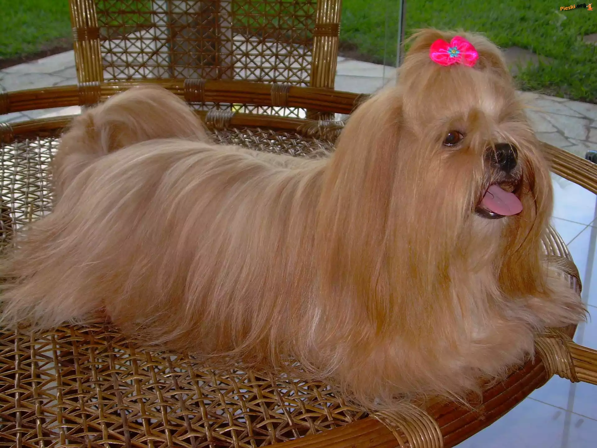wyczesany, Lhasa Apso Lhasa Apso, kokardka Lana Del Rey, Pies, Lhasa Apso Pies, Różowa, Gerbera, Lhasa Apso Malutki piesek, Lhasa Apso