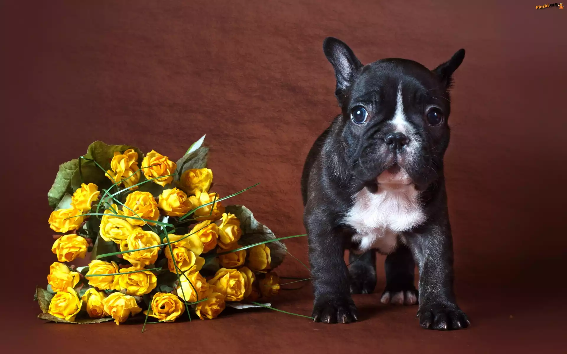 Żółtych, Szczeniak, Bukiet, Róż, Pieski