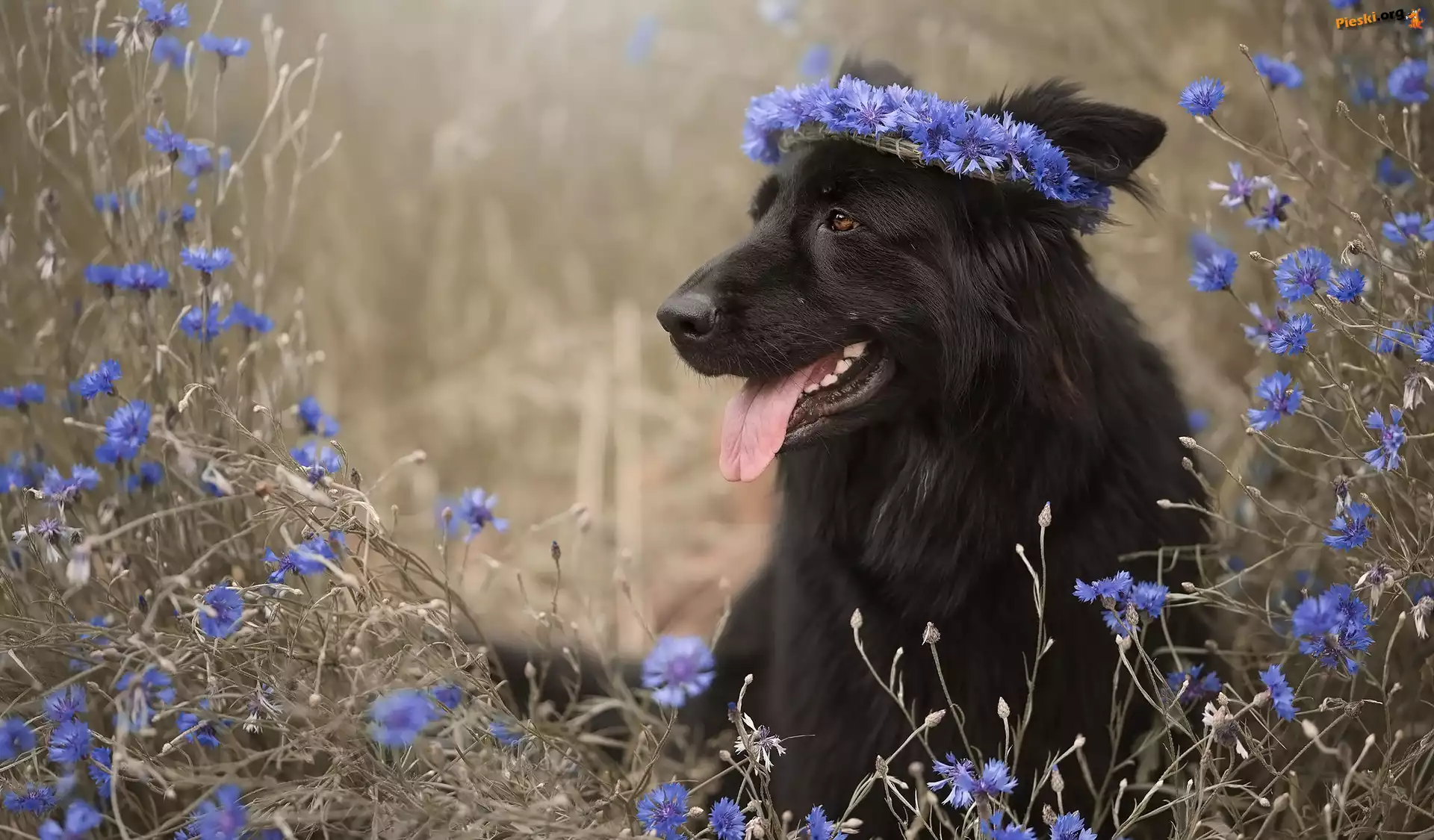 Czarny owczarek niemiecki, Kwiaty, Chabry, Pies