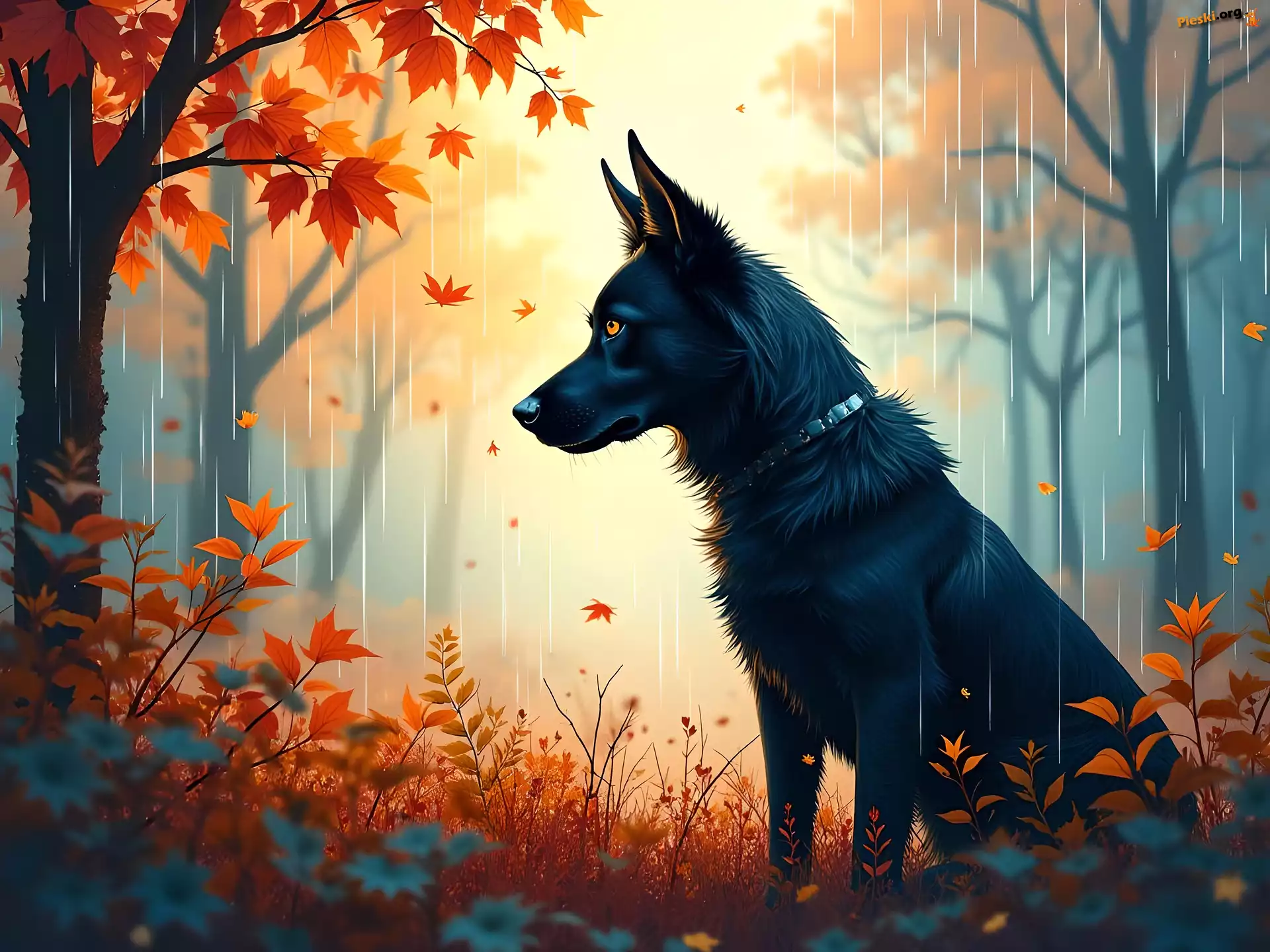 Grafika, Pies, Jesień, Deszcz, Czarny, Las, Drzewa, Pieski