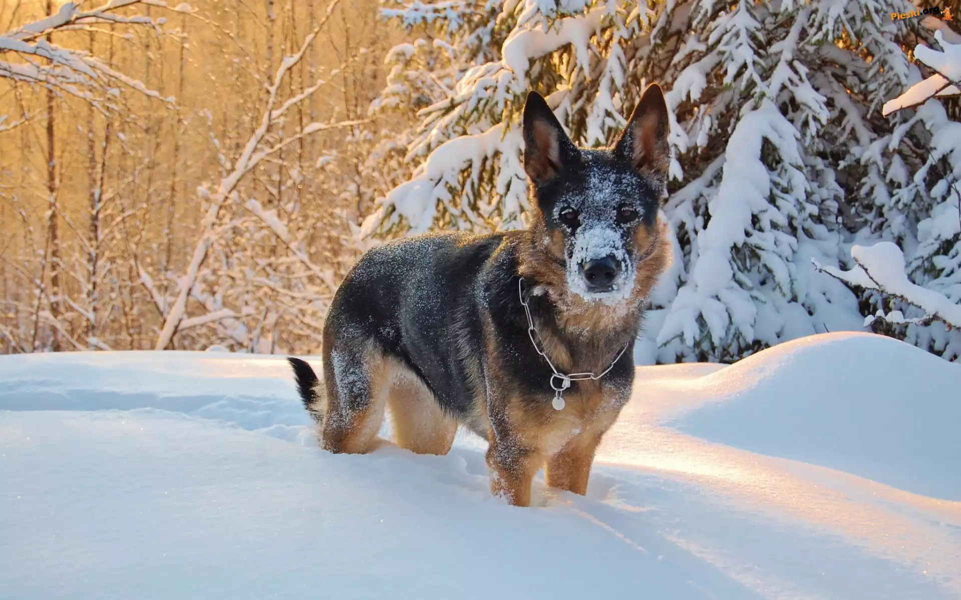 Śnieg, Owczarek niemiecki, Drzewa, Zima