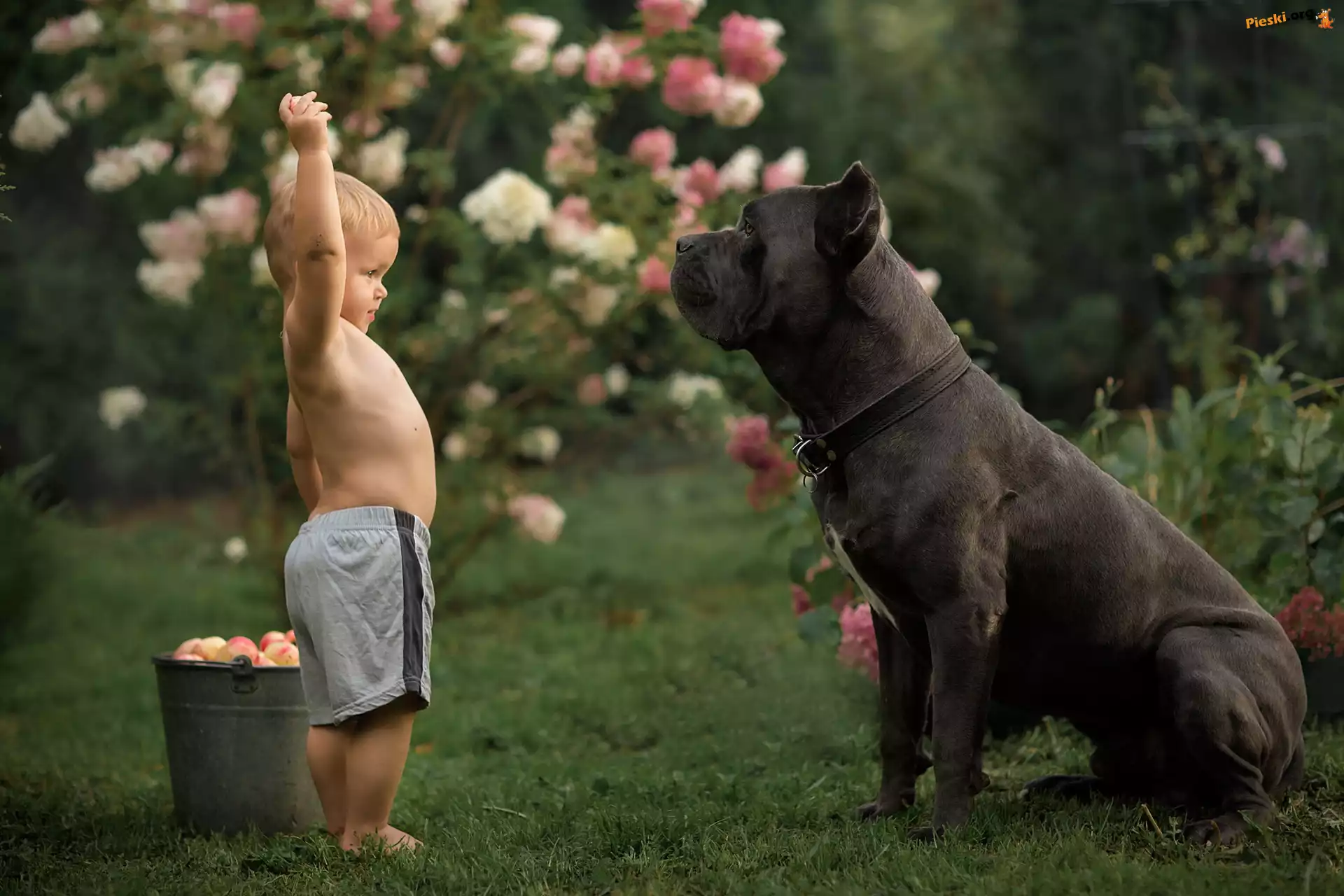 Chłopiec, Duży, Wiadro, Cane corso, Pies, Dziecko, Jabłka, Pieski