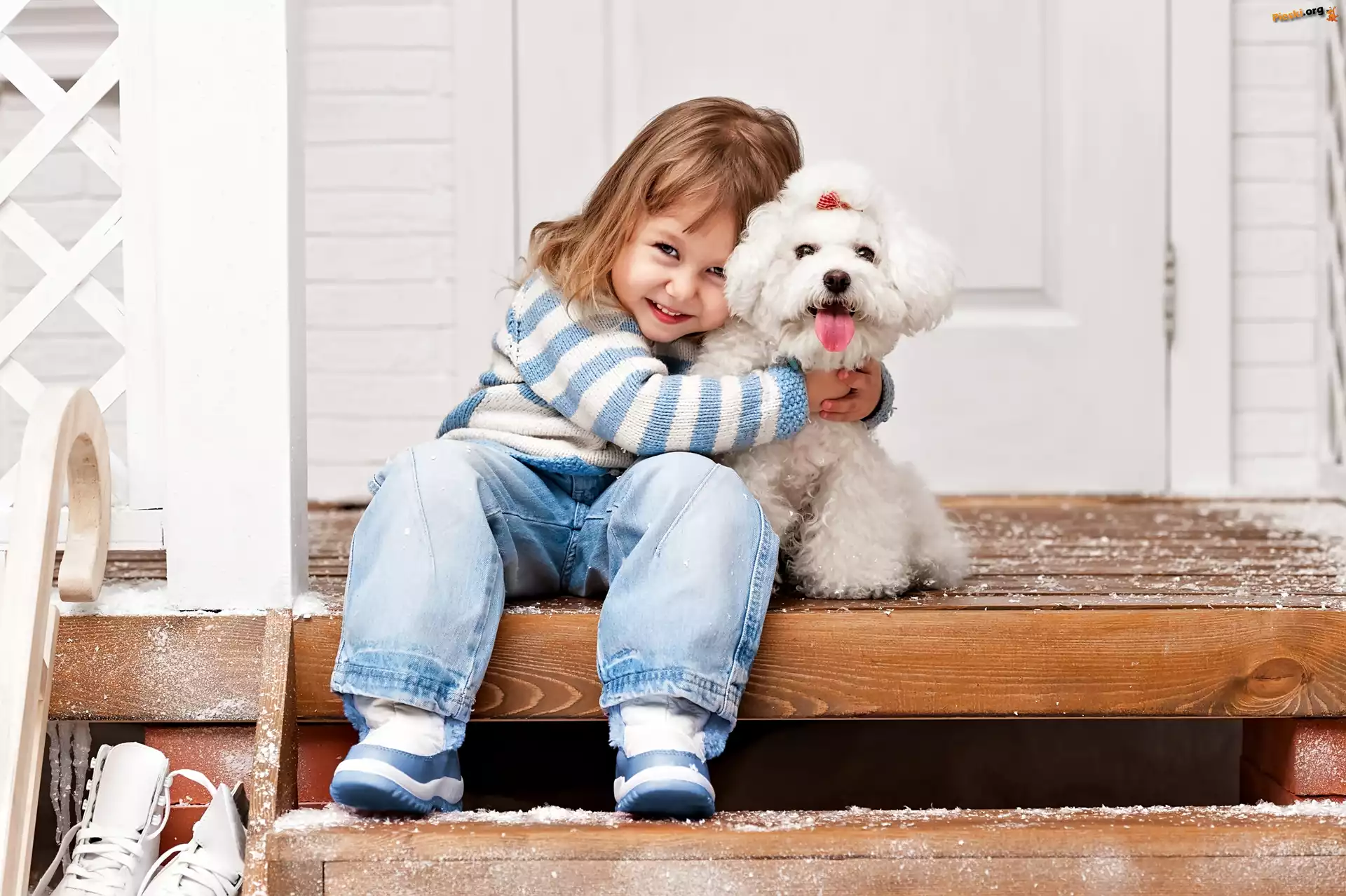 Dziewczynka, Pudel miniaturowy, Schody, Pieski