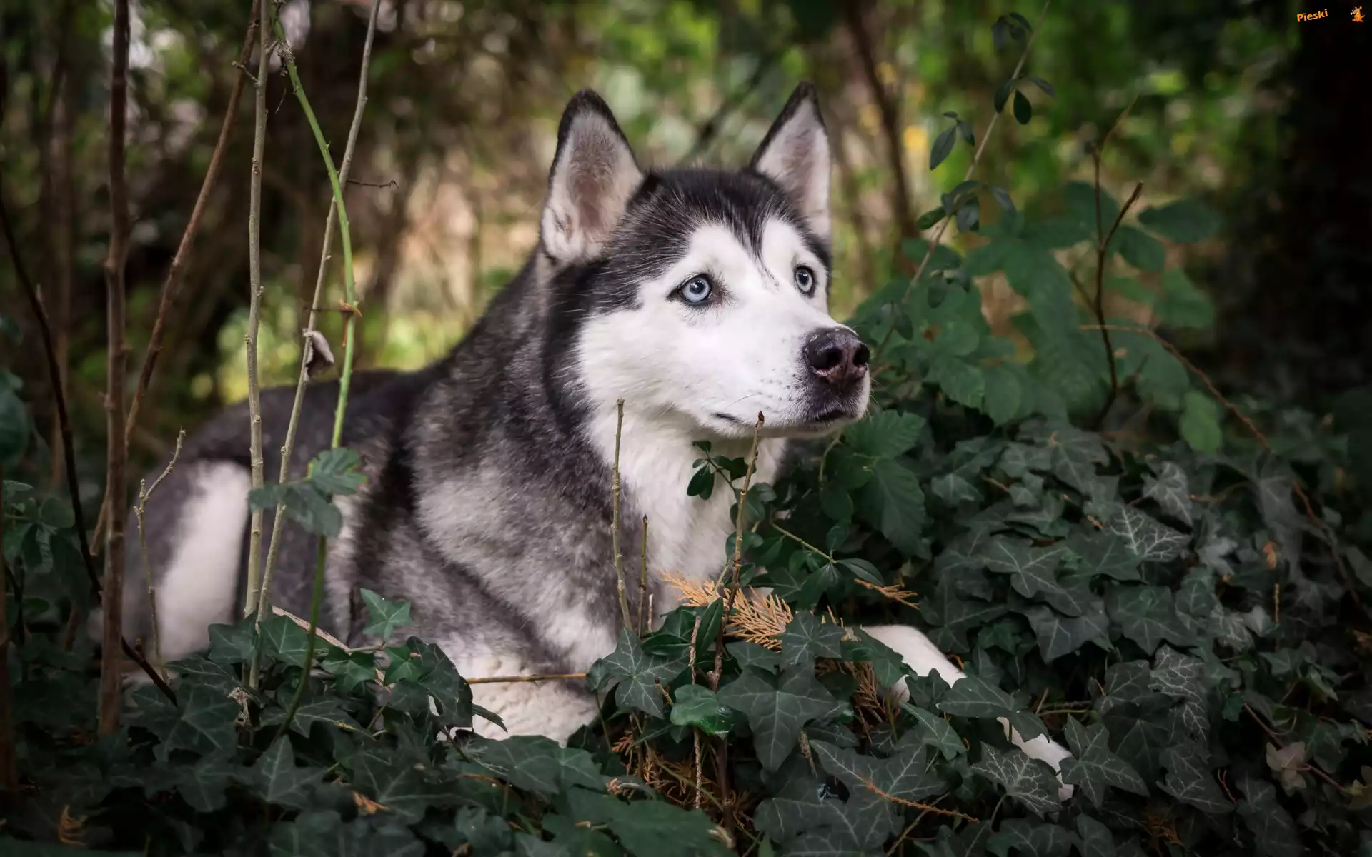 Gałązki, Siberian husky, Rośliny, Bluszcz, Pieski