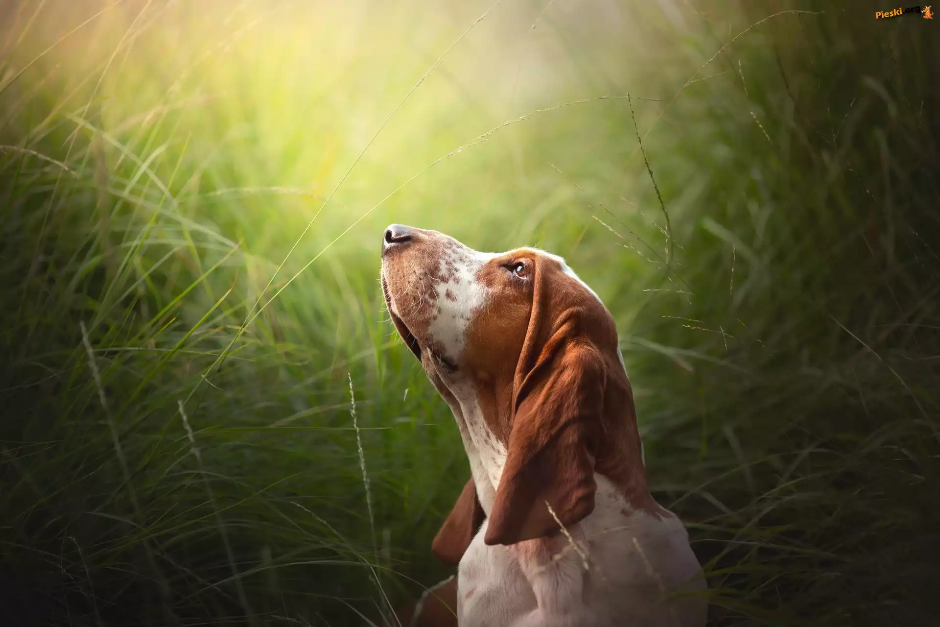 Głowa, Basset hound, Pies, Uniesiona, Trawa, Pieski