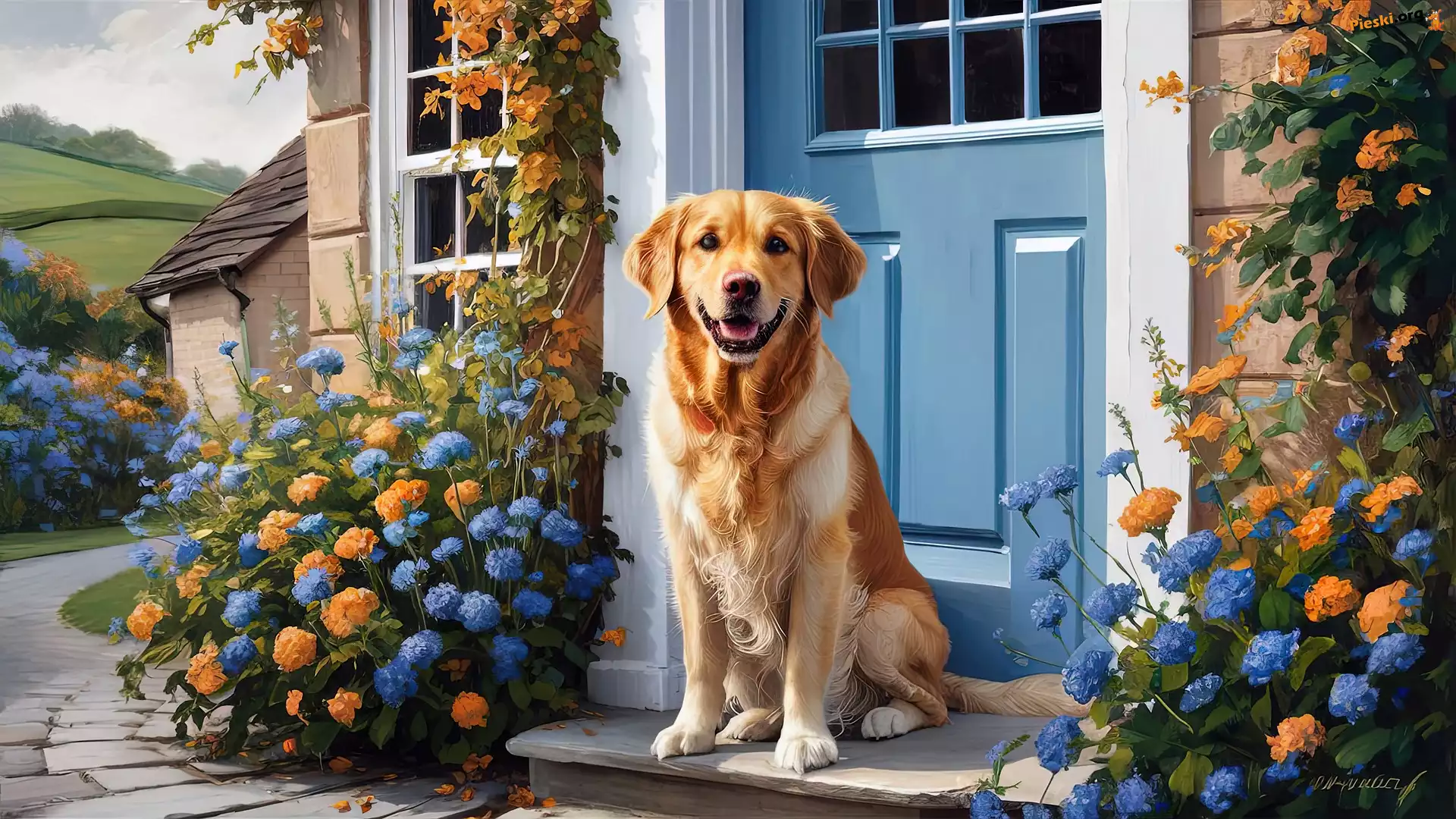 Dom, Golden retriever, Kwiaty, Pies, Niebieski, Drzwi, Pieski