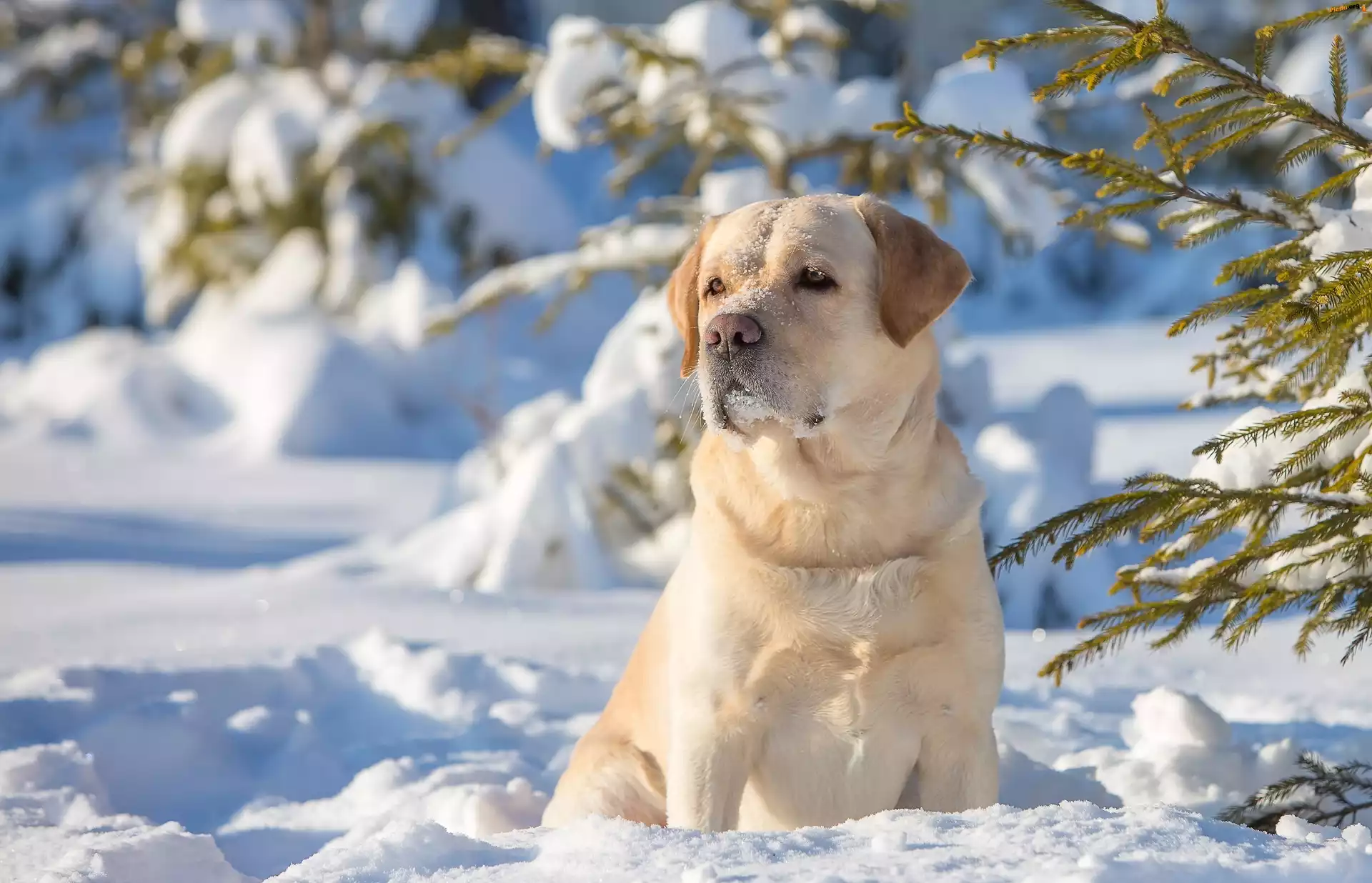Las, Golden Retriever, Drzewa, Zima