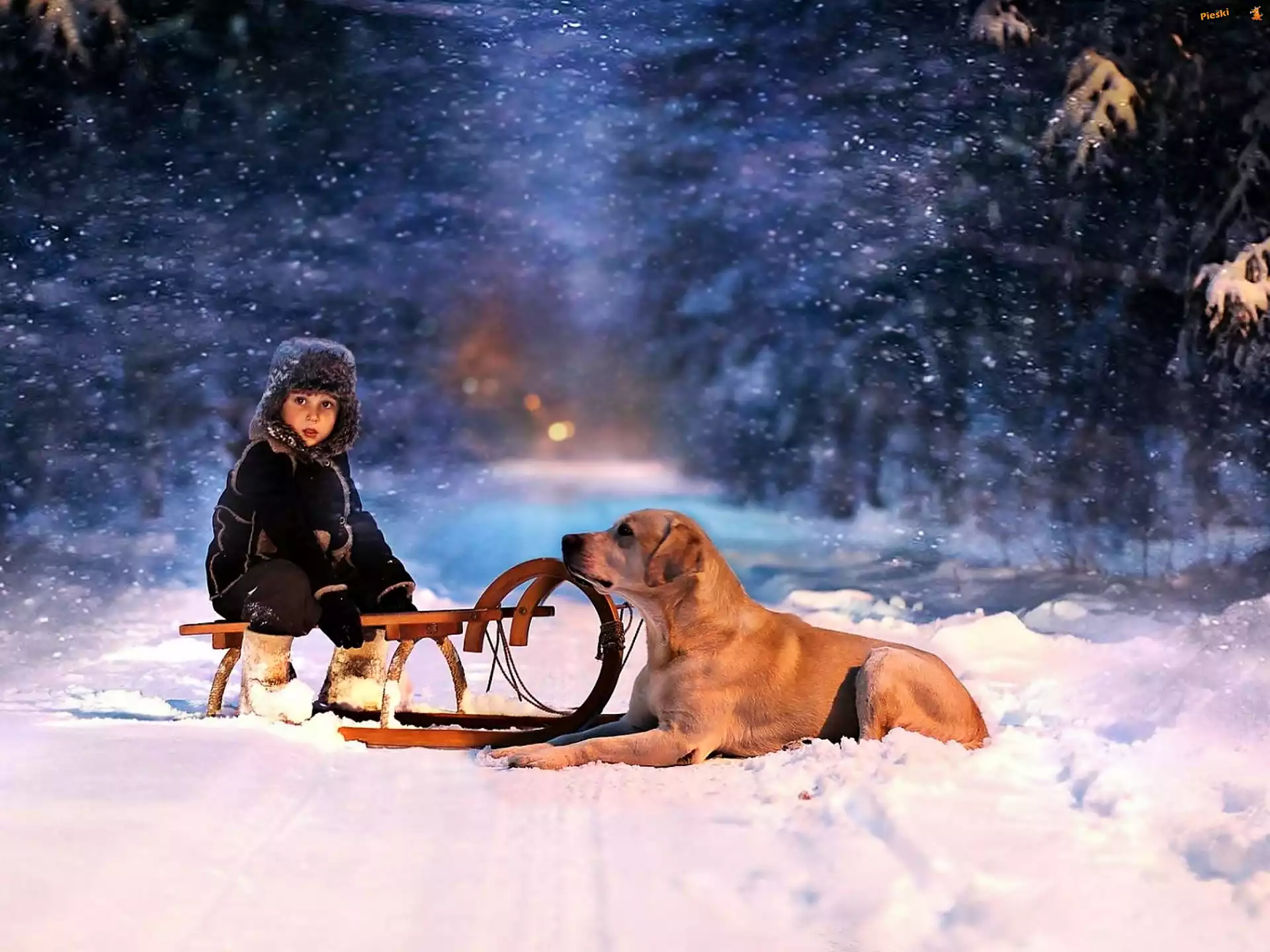 Las, Chłopczyk, Pies, Zima, Pieski