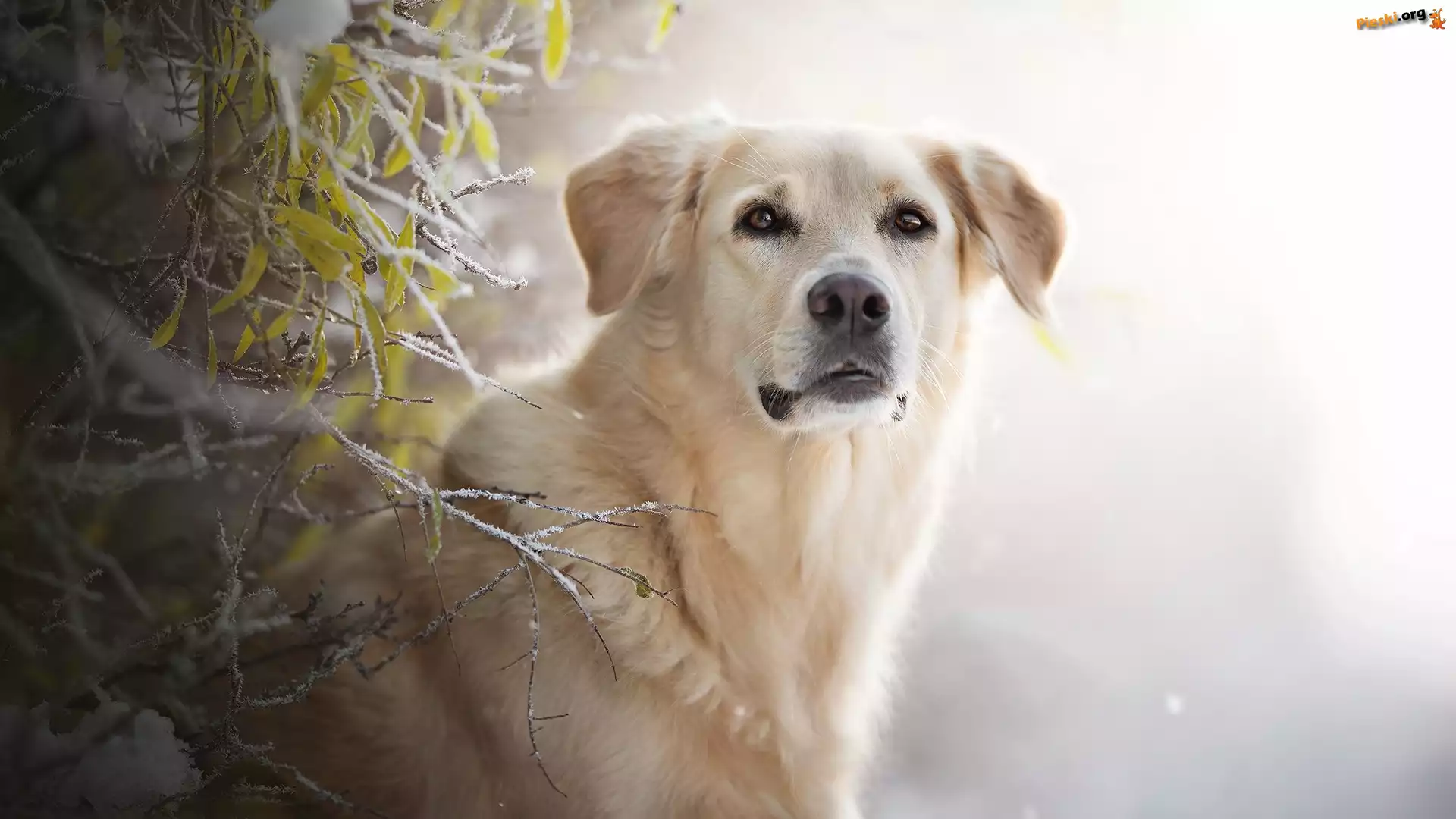 Pies, Listki, Gałązki, Golden retriever, Mordka, Szron, Pieski