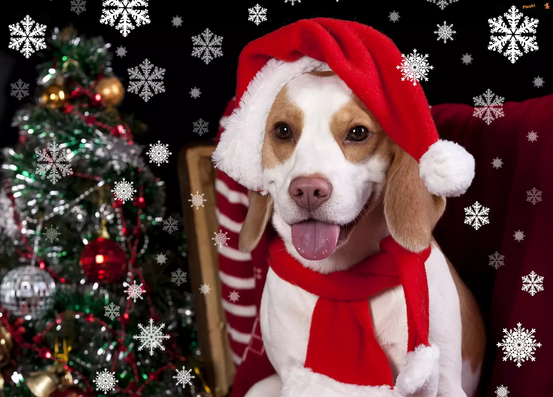 Mikołaja, Beagle, Pies, Czapka, Choinka, Pieski