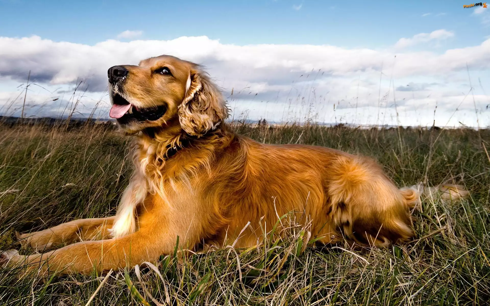Niebo, Golden Retriever, Pies, Trawa, Chmury, Pieski