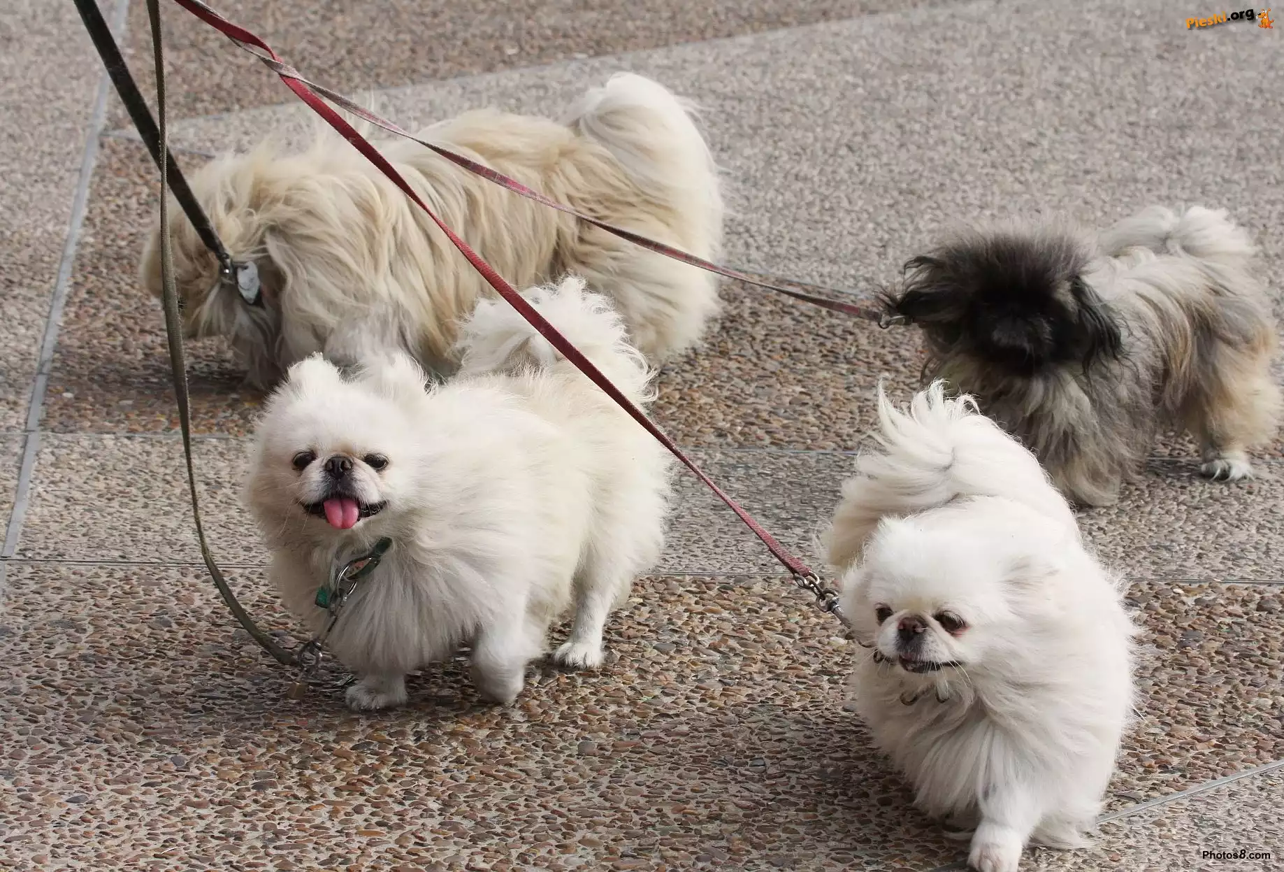 cztery, Pekińczyki, smycze, Pieski