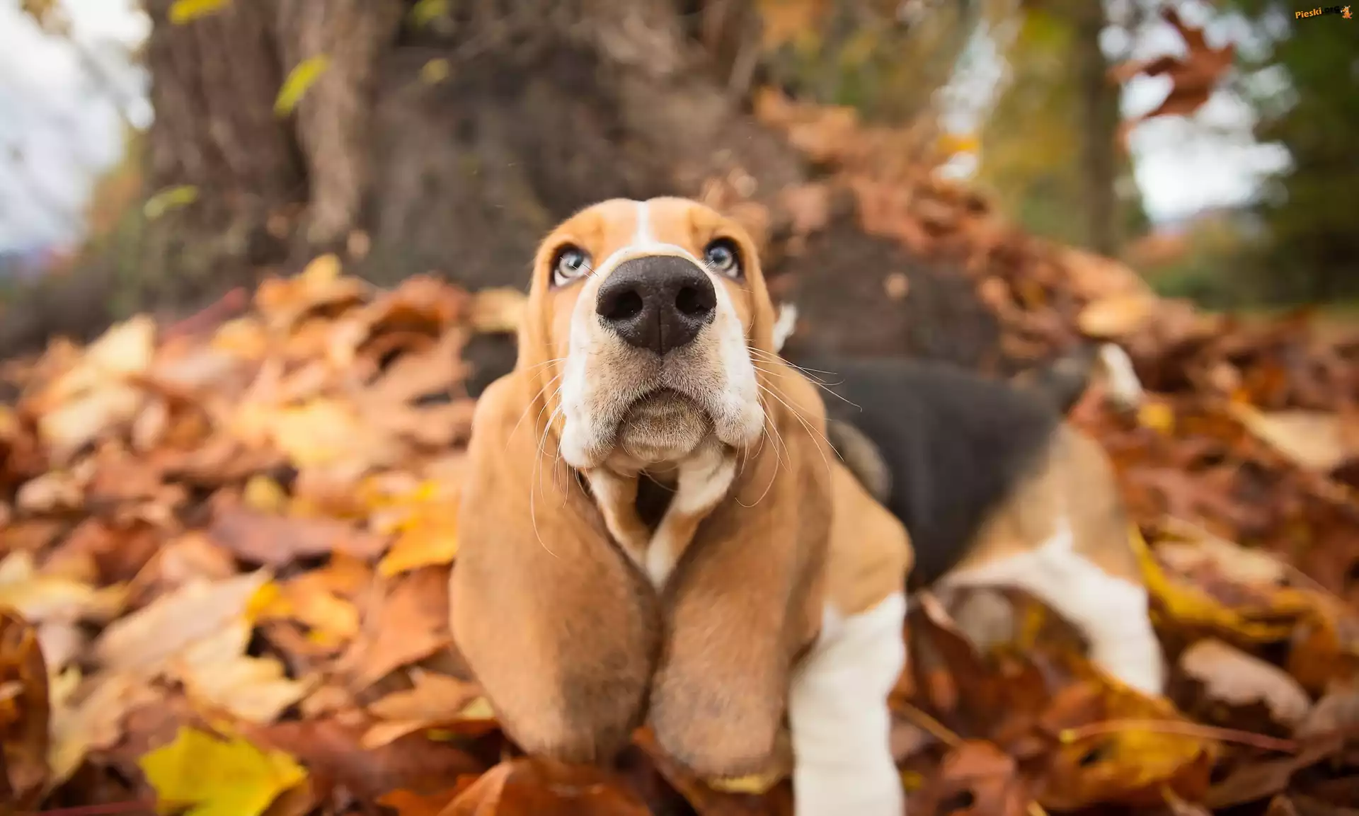 Pies, Basset hound, Liście, Pieski