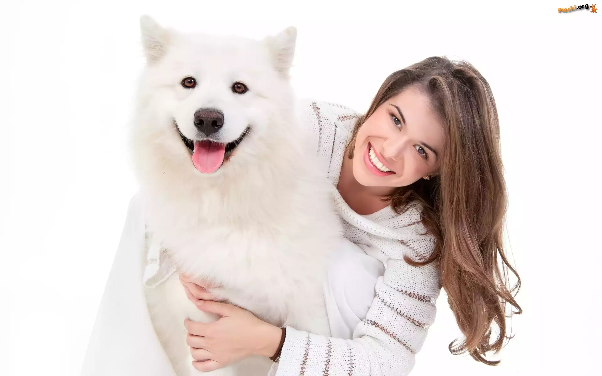 Pies, Uśmiechnięta, Kobieta, Samojed, Pieski