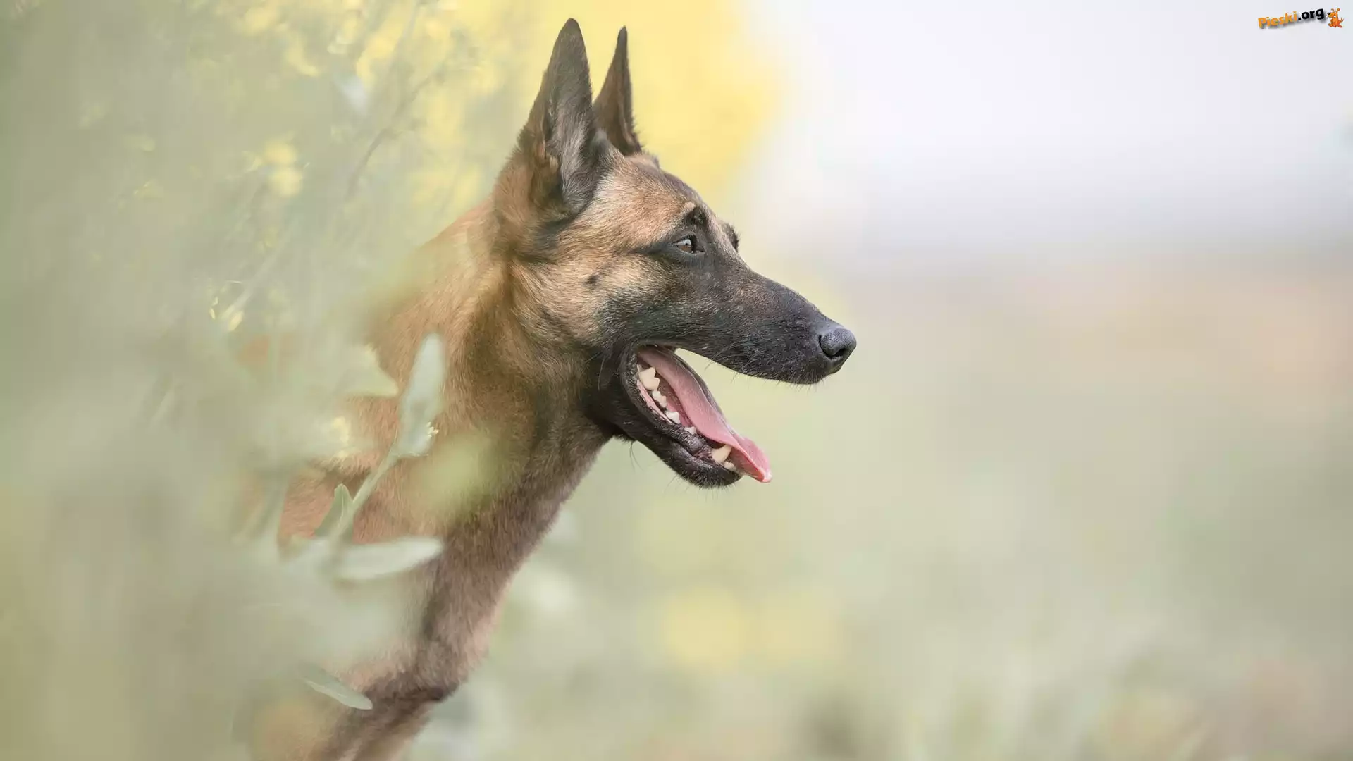 Pies, Owczarek belgijski malinois, Mordka Sowa, Pies, Owczarek belgijski Malinois, Syczek Wrzosy, Pies, Rozmyte, Mordka, Owczarek belgijski malinois, Jęzor, Tło