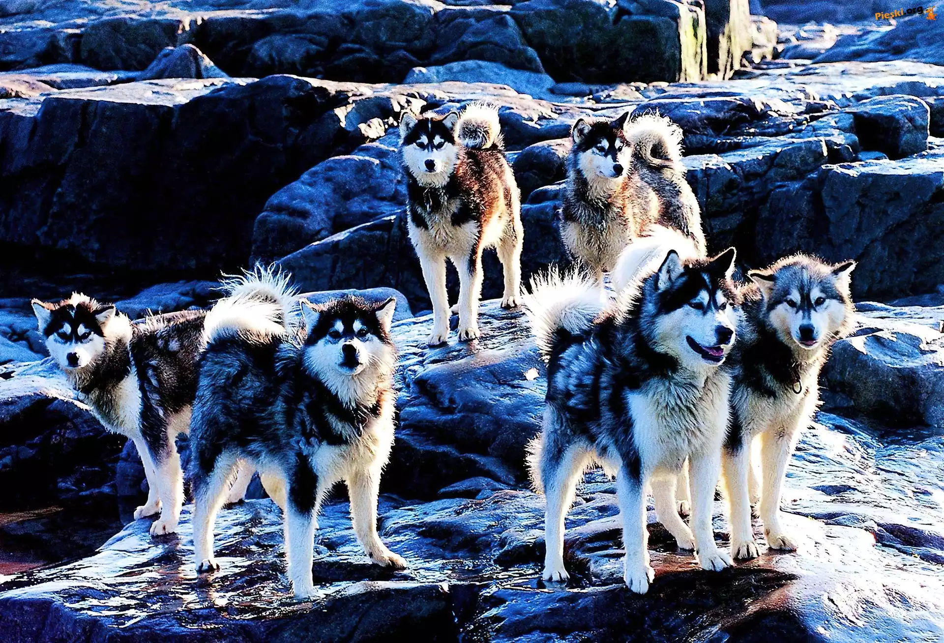 Pieski, Siberian Husky, Skały