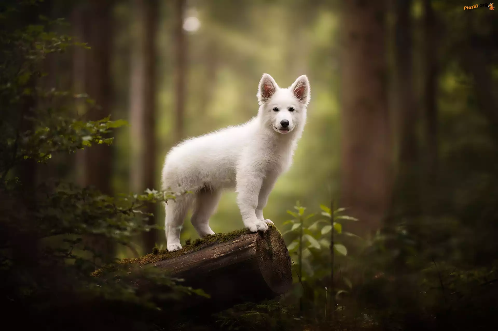 Biały, Pniak, Biały owczarek szwajcarski, Pies, Szczeniak, Las, Pieski