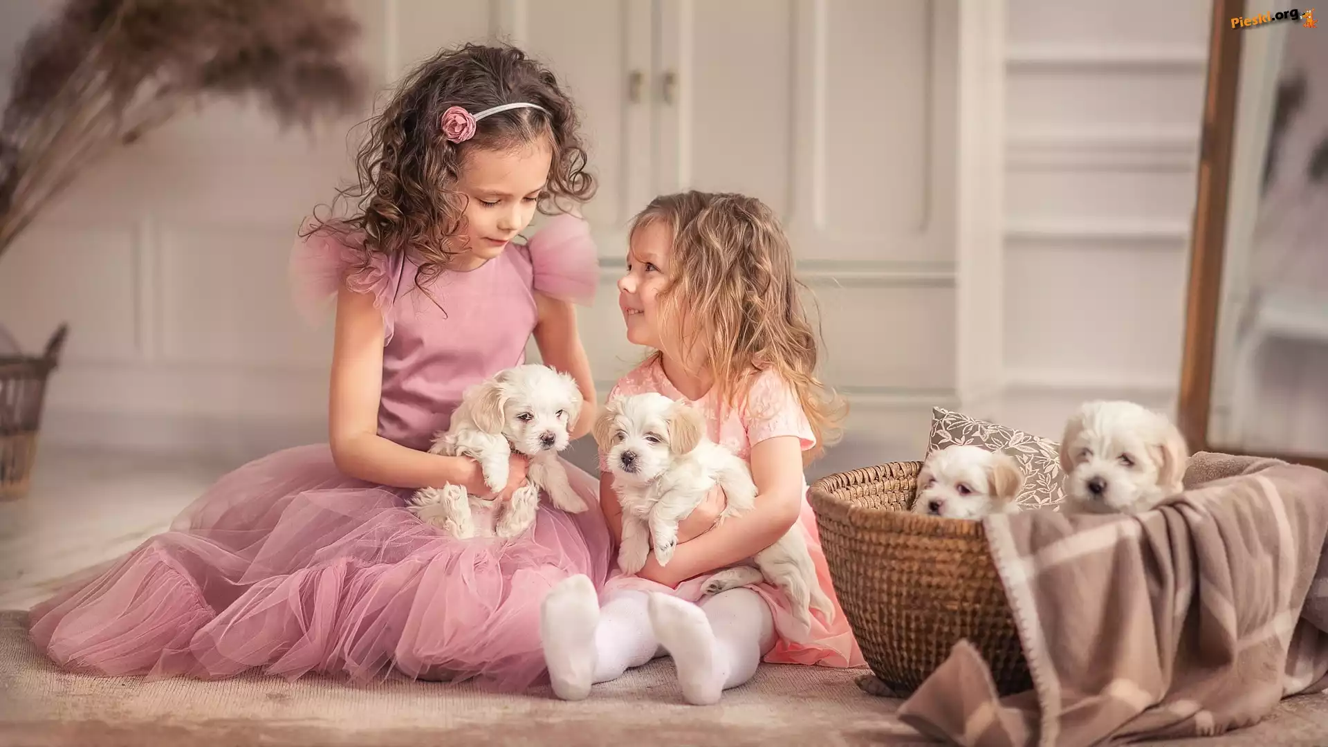 Psy, Dziewczynki, Dzieci, Kosz, Szczeniaki, Pieski