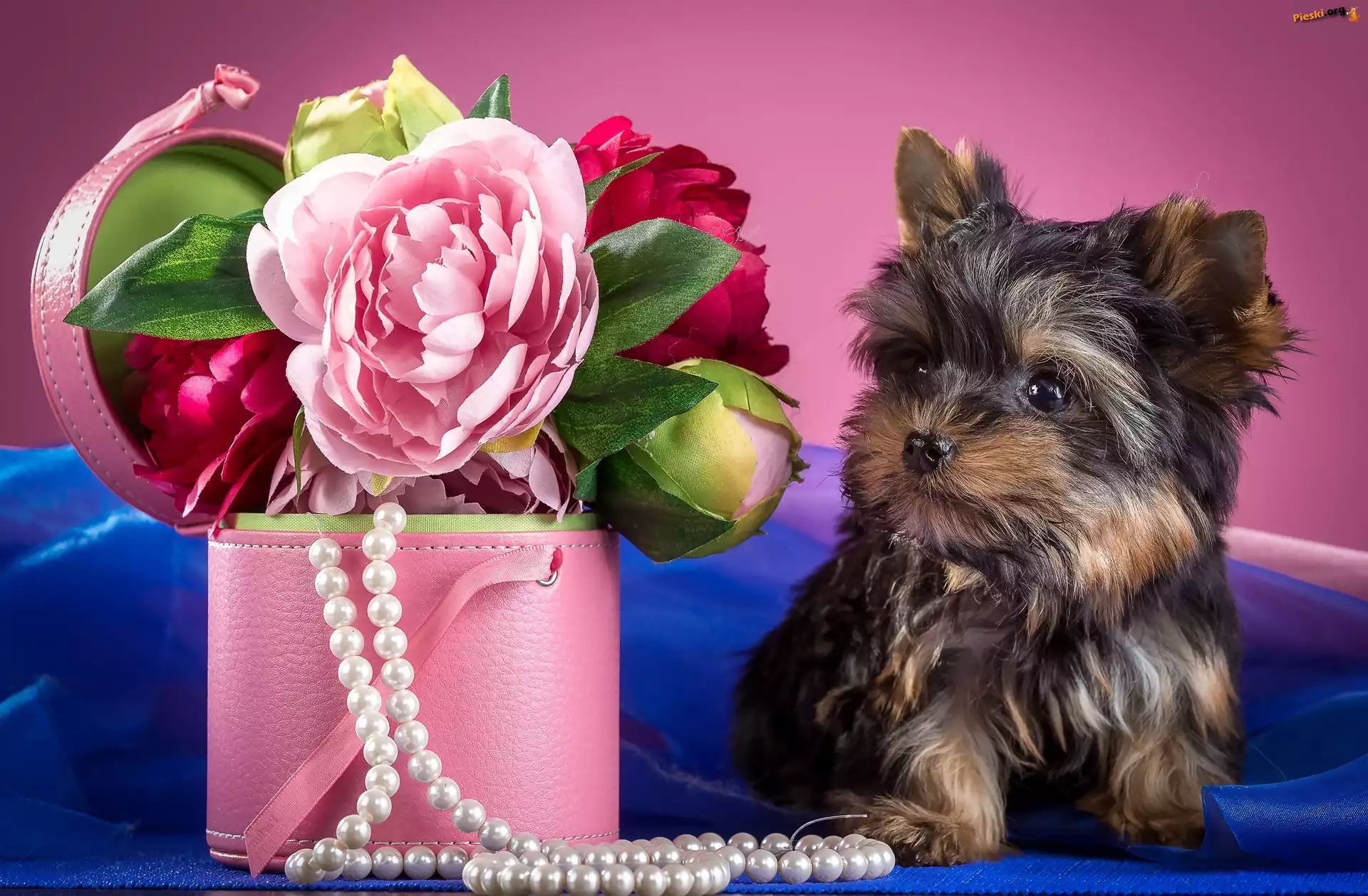 Pudełko, Yorkshire Terrier, Piwonie, Perły, Pieski