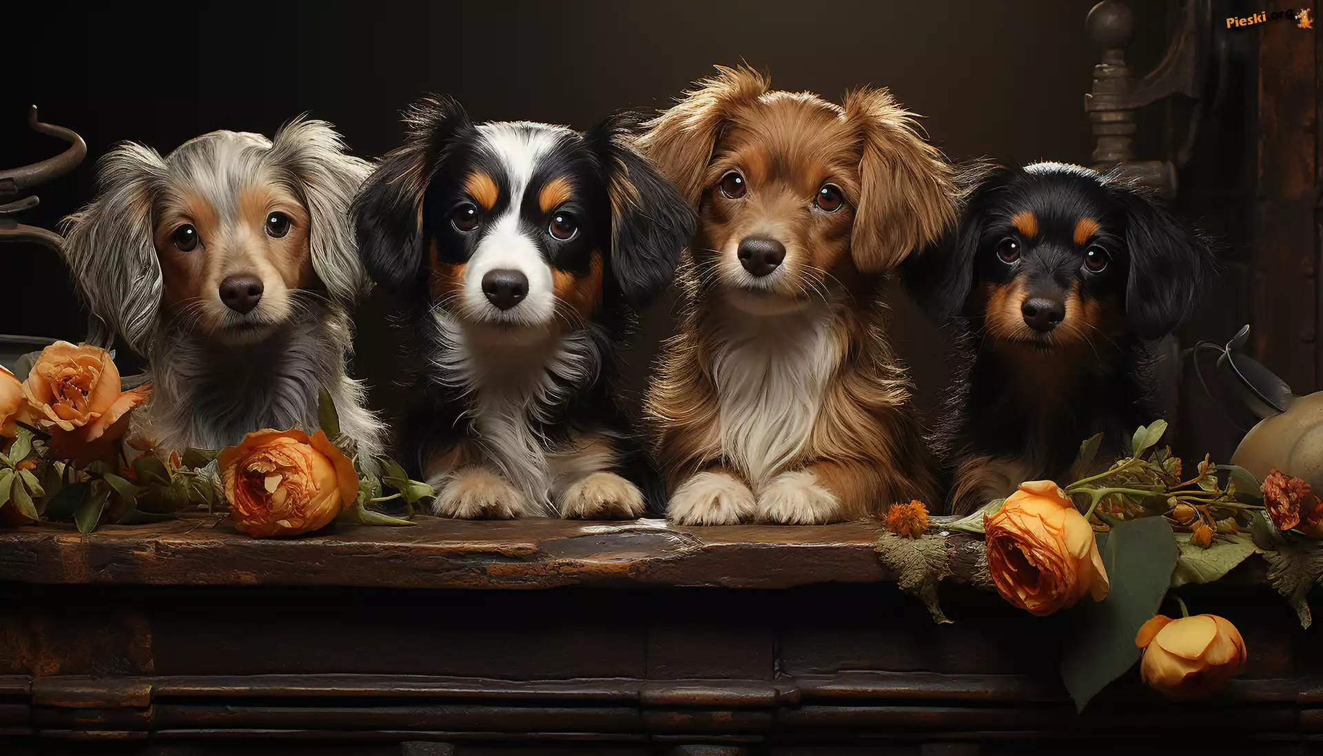 Szczeniaki, Róże, Cztery, Kwiaty, Psy, Pieski