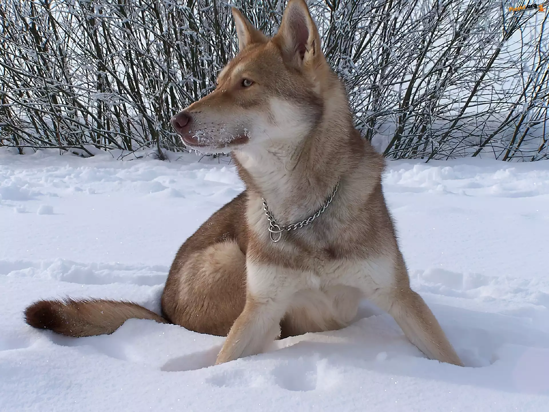 Saarlooswolfhond, śnieg, krzaki, Pieski
