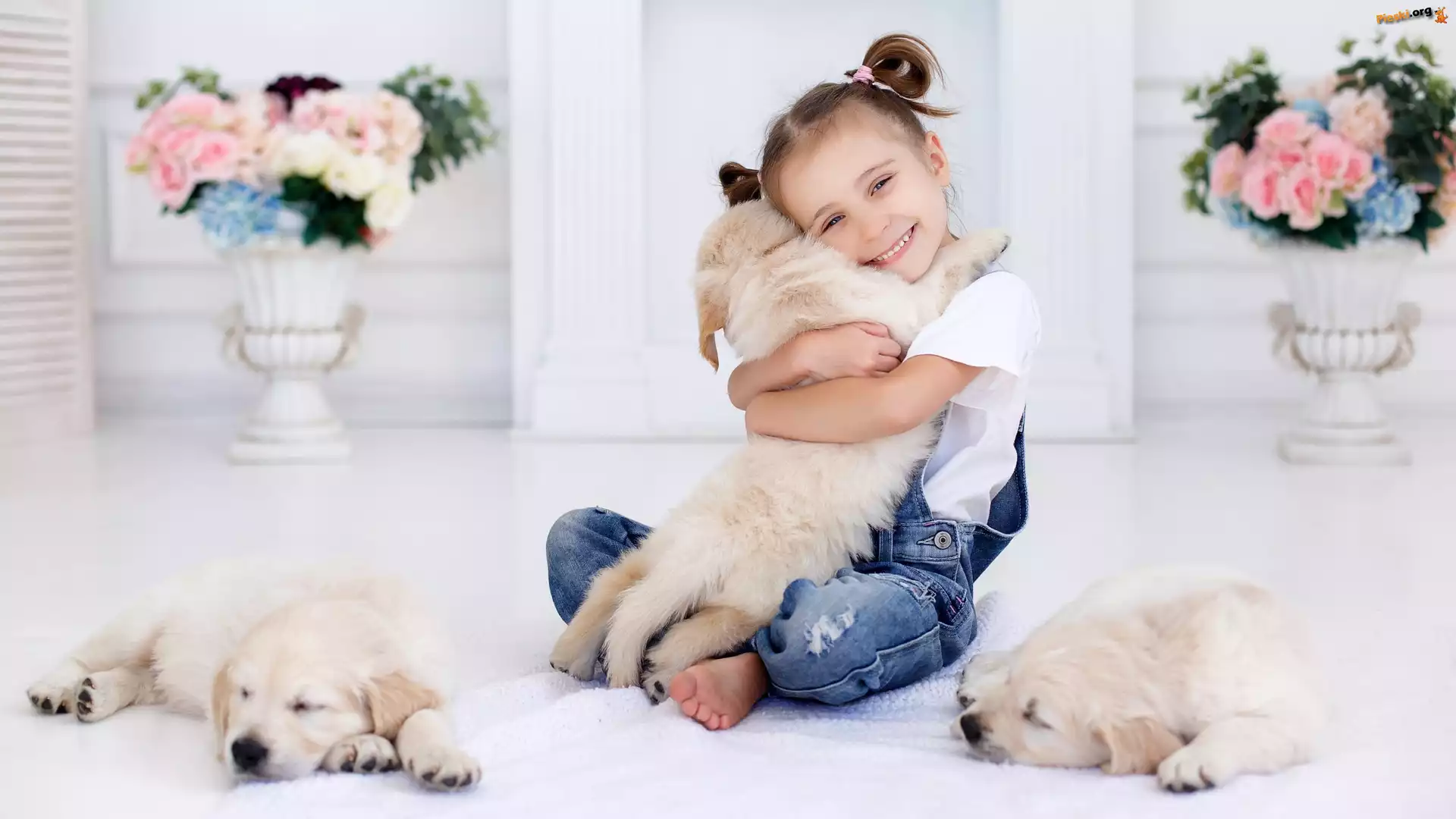 Szczeniaki, Dziewczynka, Psy, Golden retrievery