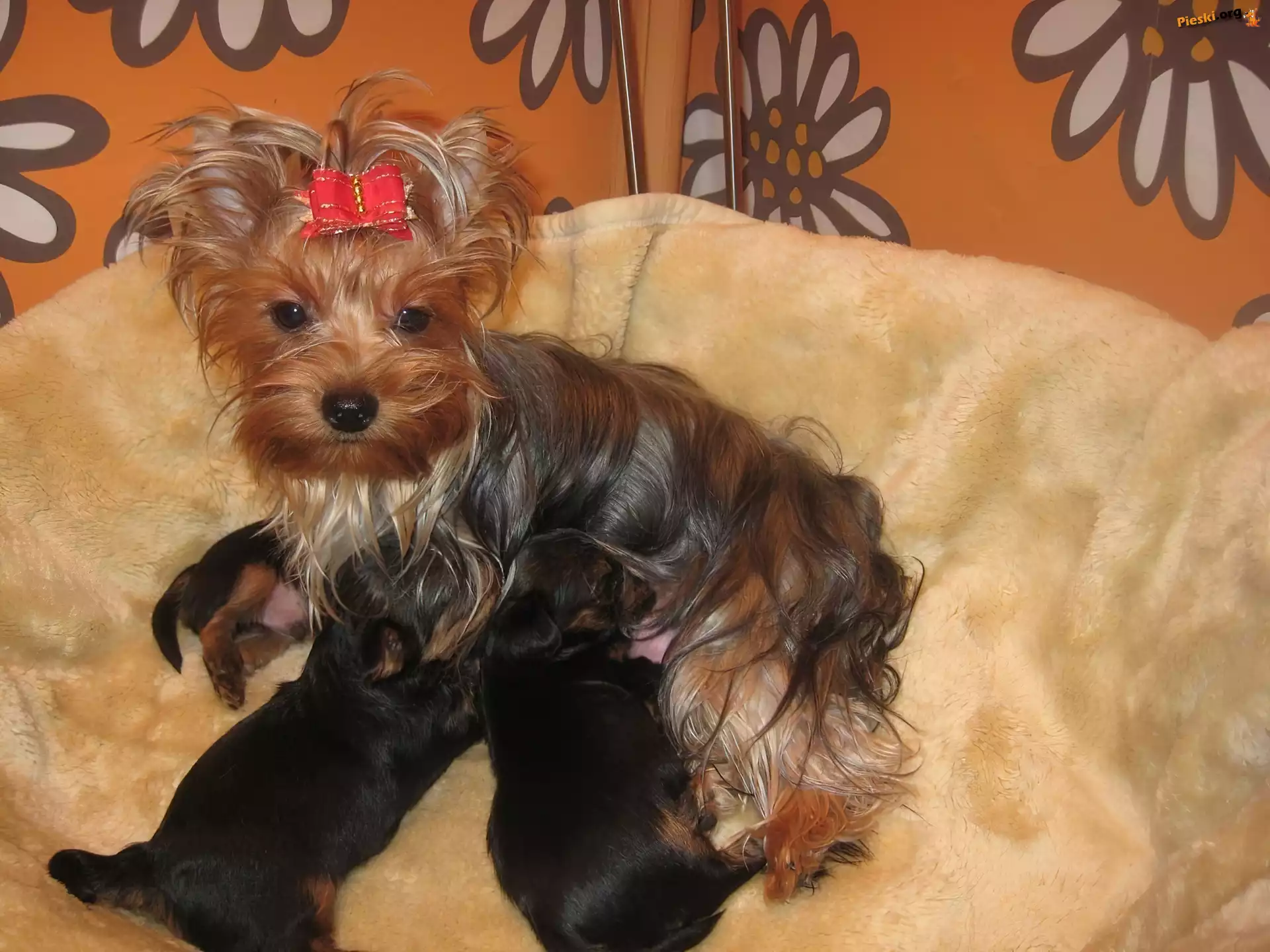 szczeniaki, suka, karmiąca, trzy, Yorkshire Terrier, Pieski