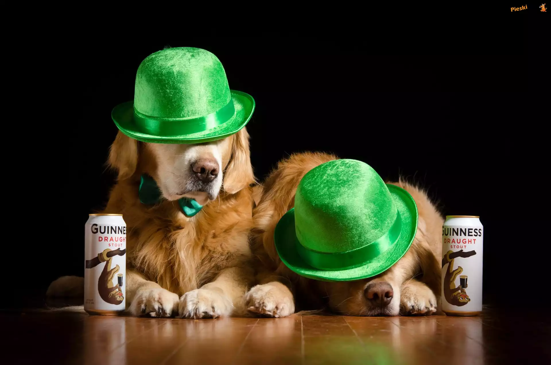 Puszki, Psy, Piwo, Zielone, Golden retriever, Kapelusze, Czarne tło