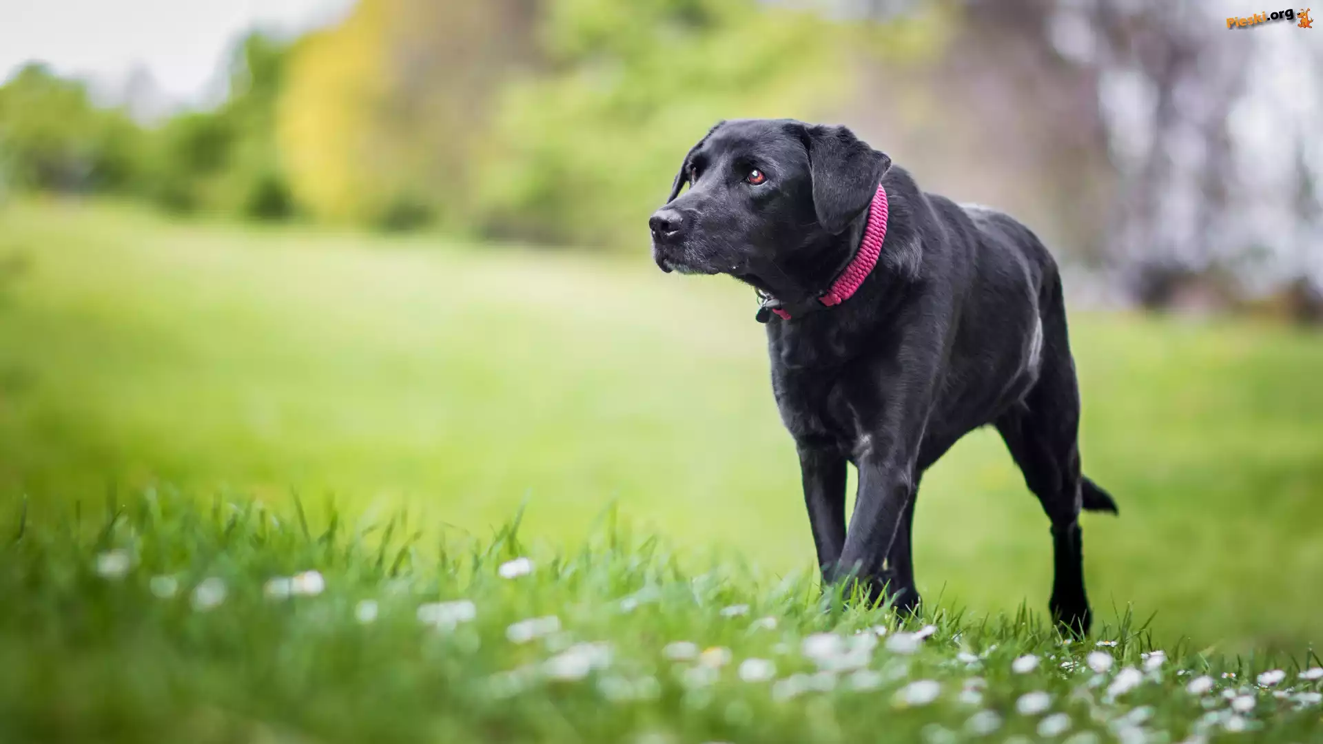 Trawa, Pies, Czarny, Obroża, Kwiaty, Pieski