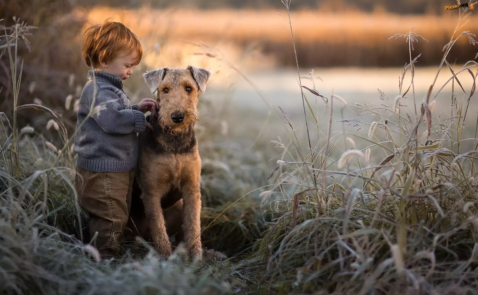 Trzciny, Airedale terrier, Pies, Chłopiec, Trawy